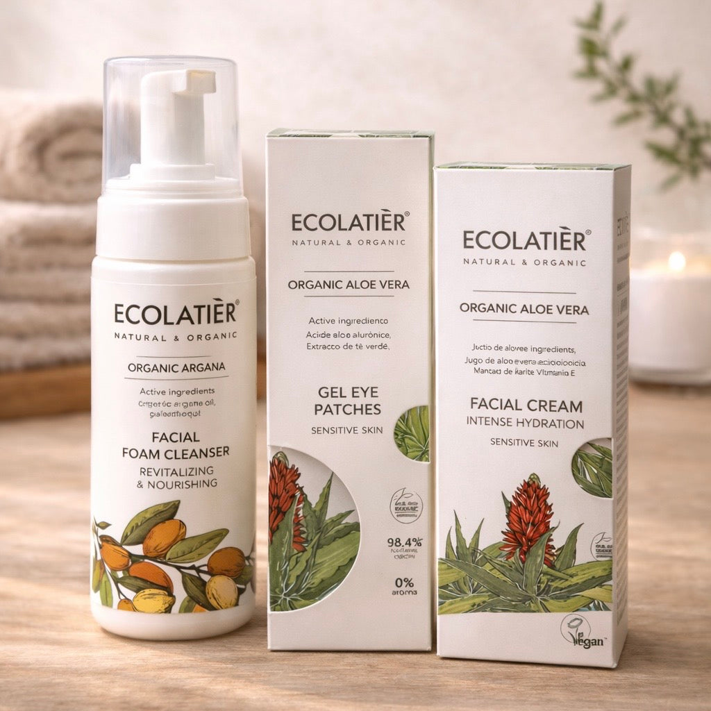 Este ritual combina aceite de argán ecológico, aloe vera ecológico e hialuronato de sodio para limpiar sin alterar el manto hidrolipídico, hidratar en profundidad y reducir la aparición de líneas finas alrededor de los ojos. Tres productos que trabajan juntos para que tu piel se vea más luminosa, más suave y más descansada.